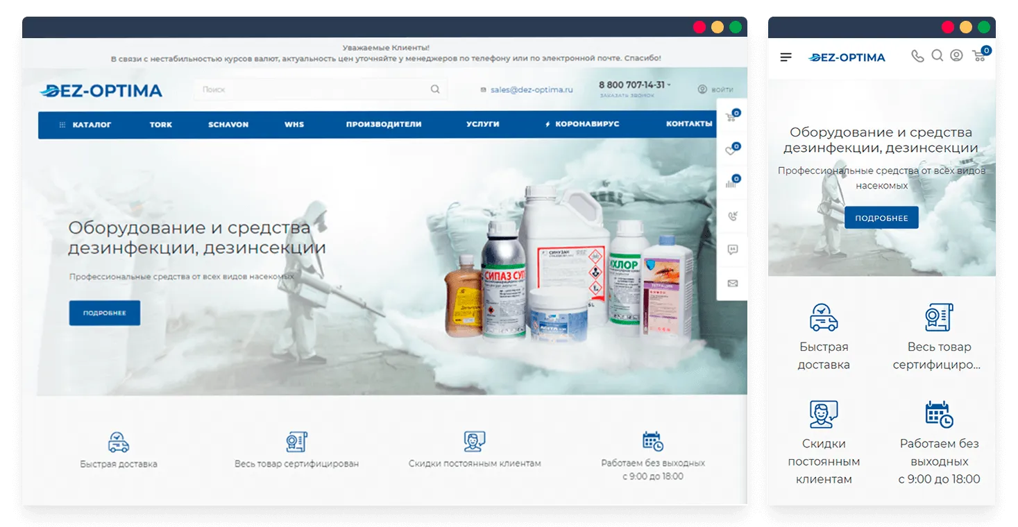 Проанализировали нишу магазинов оборудования, средств дезинфекции. Собрали семантическое ядро, проработали структуру сайта.