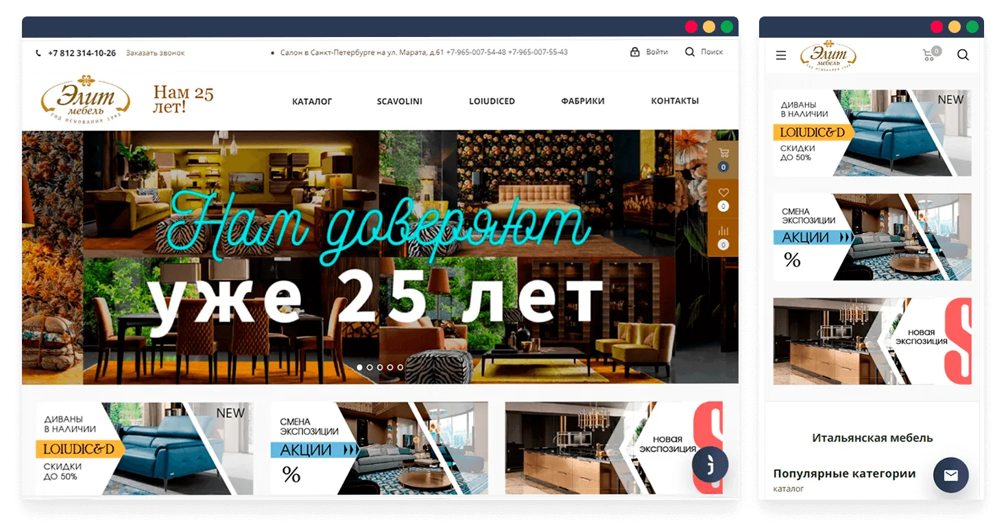 Компания «Элит-Мебель» уже более 25 лет занимается продажей элитной итальянской мебели и имеет четыре интерьерных шоу-рума в разных районах Санкт-Петербурга. В магазине представлены готовые интерьерные решения от ведущих итальянских брендов Scavolini, Loiudiced, Angelo Cappellini, Caroti, Cavio Casa и др. В наличии и под заказ кухни, гостиные, спальни, диваны, системы хранения и детская мебель.